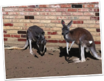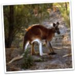 Kangaroos are extremely powerful animals. Sometimes male kangaroos will wrestle for fun, or over potential mates. This action is often referred to as “boxing”. The kangaroo is not actually able to make a fist. If they are able to get a hold of their opponent for balance, they will lean back on their tail and grab at each other with their hands, and then lift up their back feet and strike with their back feet. Kangaroos have a long tapered tail that assists them in walking, and as a rudder when hopping. A kangaroo may hop as fast as 35 mph, and at that speed they can cover 25 feet in a single bound. Their ability to travel long distances assists them in the hot and arid climate of the Outback with finding both food and water. They prefer to eat newly-green grasses and shrubs, therefore they must continually be on the move to find fresh resources.
