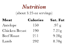compared with beef, chicken, and even lamb, antelope meat has fewer calories per serving, and is lower in saturated fat.