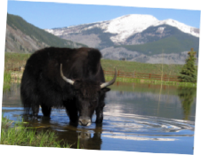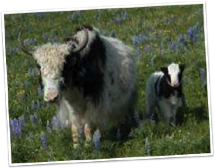 Yaks most often live at high elevations on mountain plateaus and steppes. At higher elevations there is less air pressure, making it more difficult to breathe. Yaks have a larger heart and lungs than cattle who live at lower altitudes. This allows for greater flow of oxygen to the yak’s blood. Yaks are well adapted to the cold weather with their long hair and a lack of functioning sweat glands, and they also have an additional layer of insulating fat under their skin. With the help of the adaptations, they can withstand temperatures as low as -40 degrees. Additionally the yak’s rumen, or first stomach, is larger than that of other domestic cattle. This allows them to consume and utilize lower quality forages often found in the sparse mountain environment.
